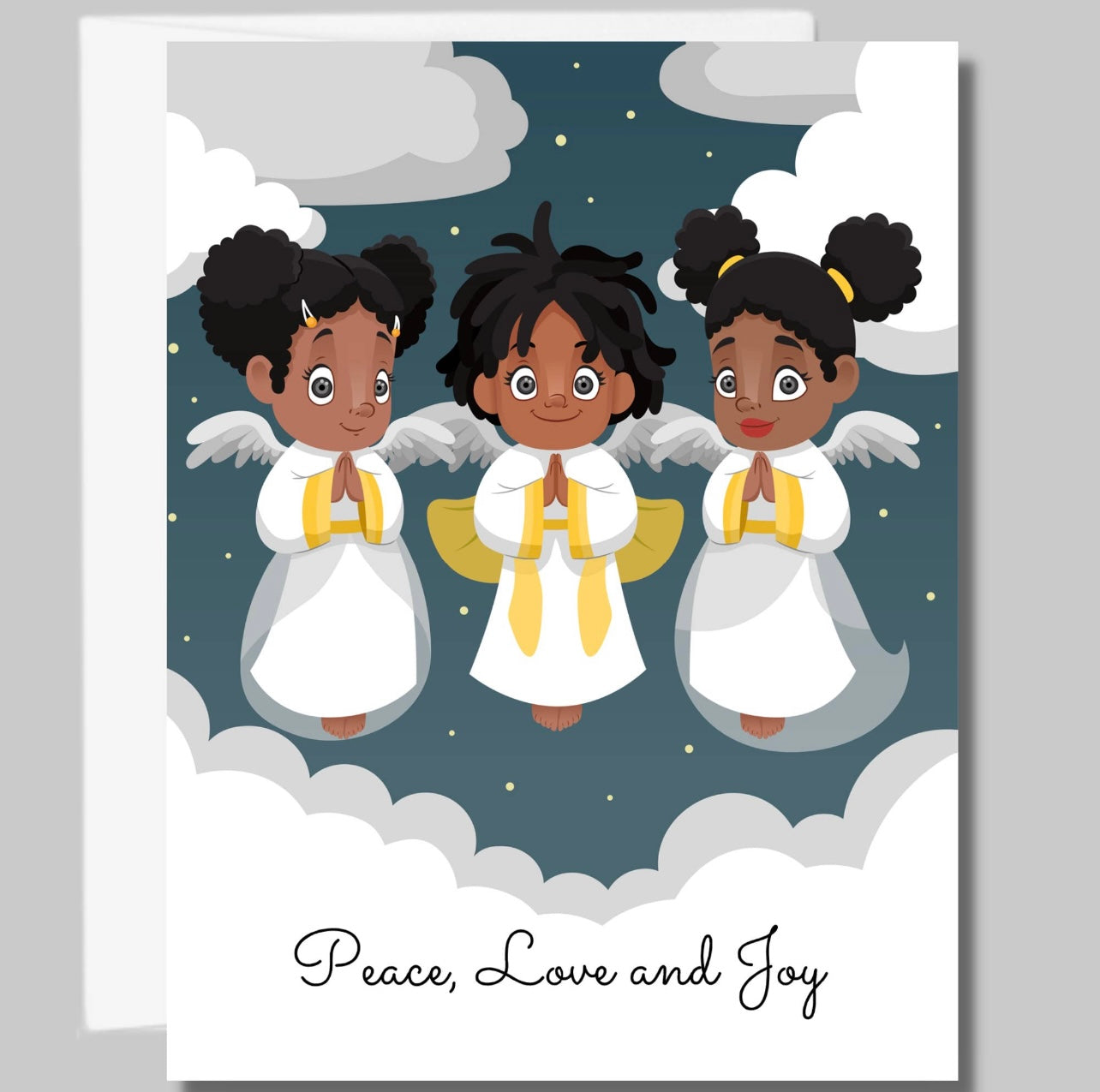 This African American Holiday Card features a three cherubs with the phrase ‘Peace Love Joy’ printed on the front.