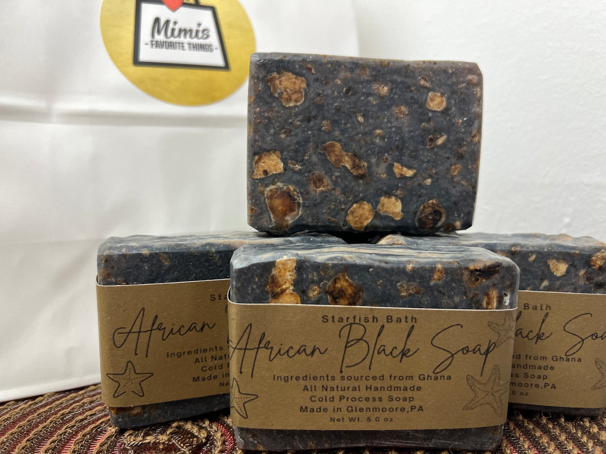 African Black Soap is a natural unscented soap using Cocoa Powder and charcoal for coloring. Many of the raw materials are sourced from Ghana Africa. The soap contains Coconut Oil, Palm Oil, Olive Oil, Canola Oil, Raw Shea Butter, Apricot Kernel Oil, Sweet Almond Oil, Kale, Castor Oil, Vitamin E.