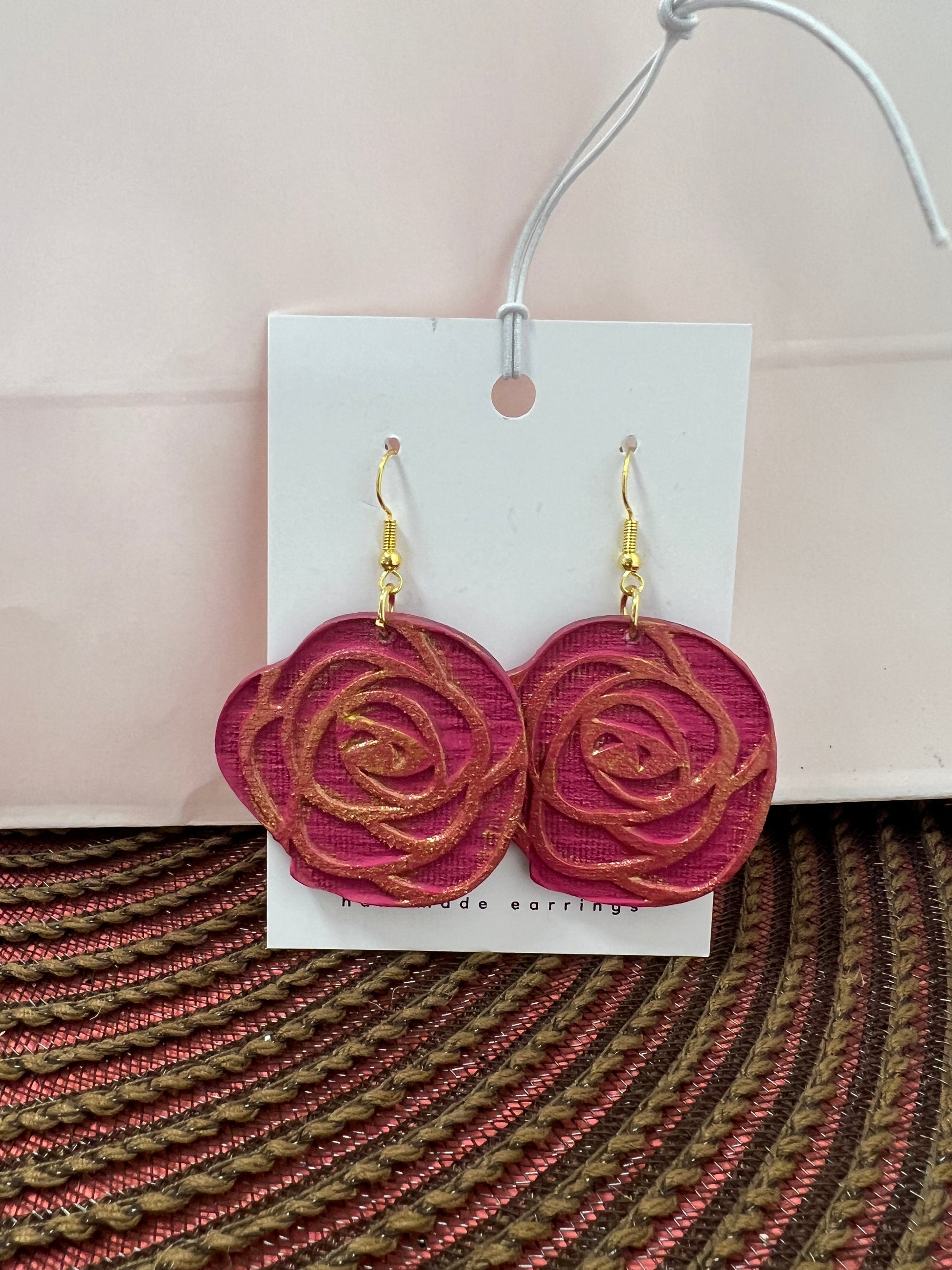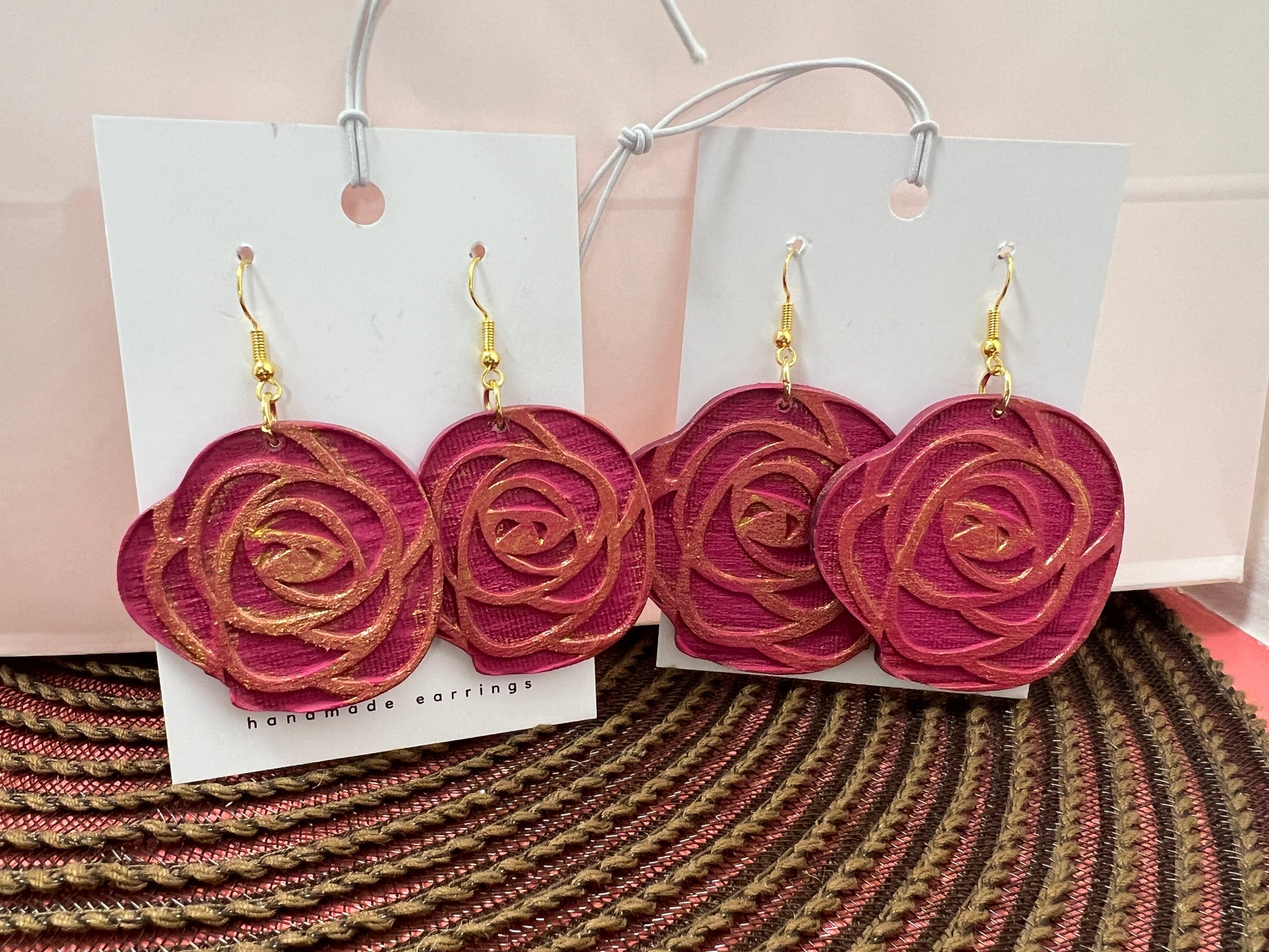 Take a chance and give this unique gift to yourself or others. These Rose Wood Dangle Earrings are tasteful yet whimsical addition to any outfit. From Valentines Day to a Garden party these lightweight wood earrings will be the talk of the party. The reverse engraving adds an unexpected dimension to these wood dangle earrings. Choose from 3 colors Tea Rose (light pink), Fuschia (vibrant pink) or Wine (dark pink red). All earrings have a gold colo rimmed accent. They are available in 40MM or 50MM sizes.