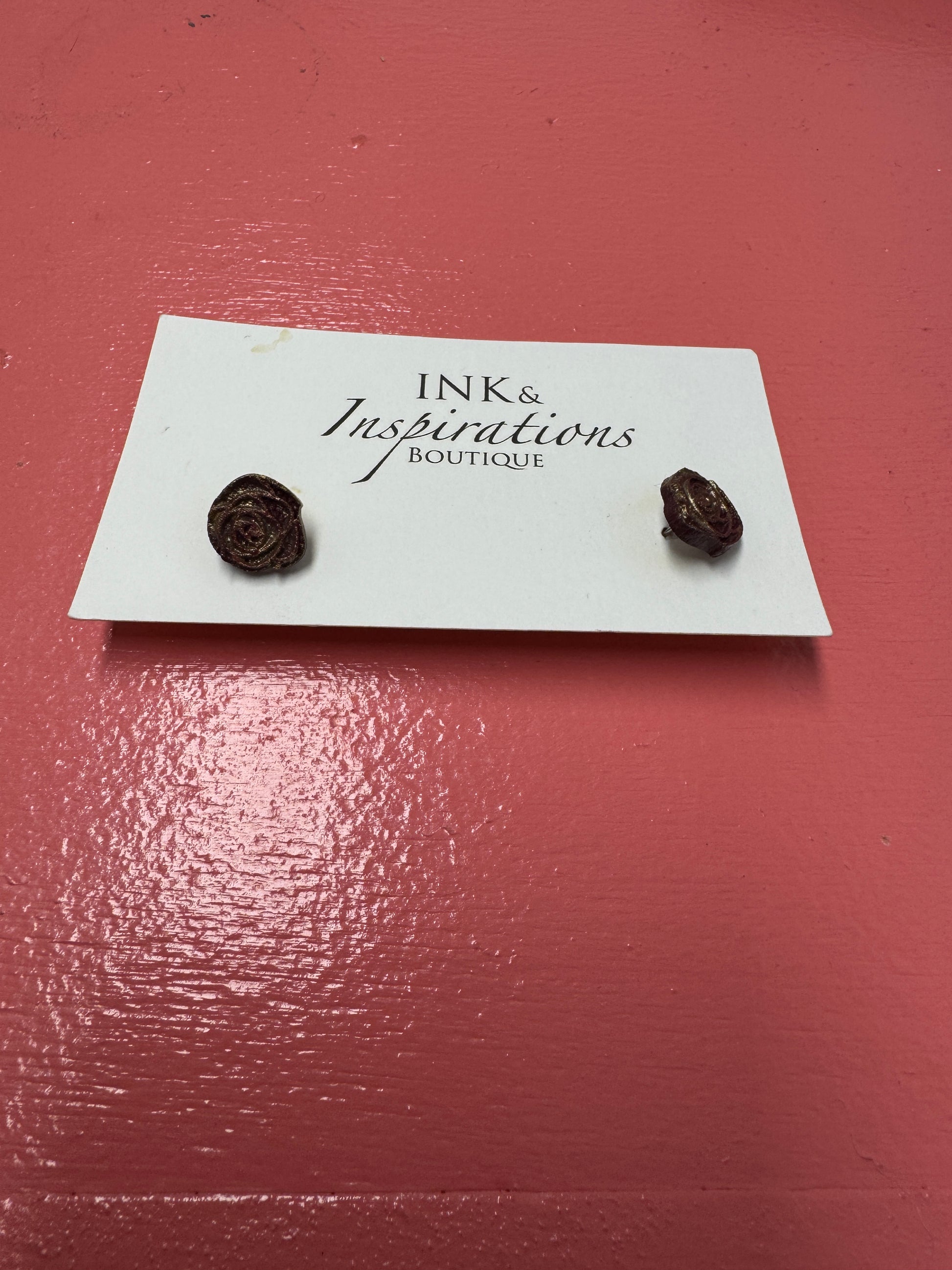 This pair of wooden rose shaped earrings is accented with stainless steel posts. They are laser engraved and hand colored.